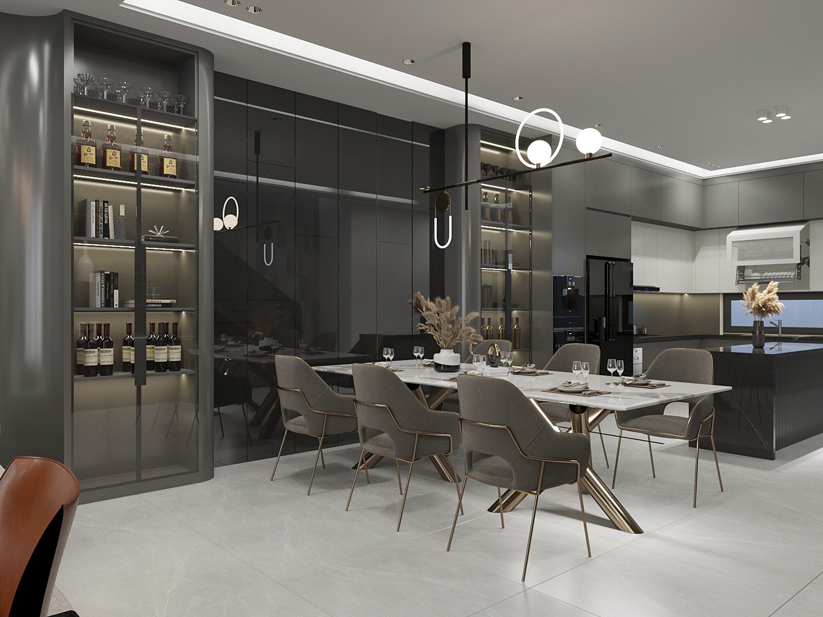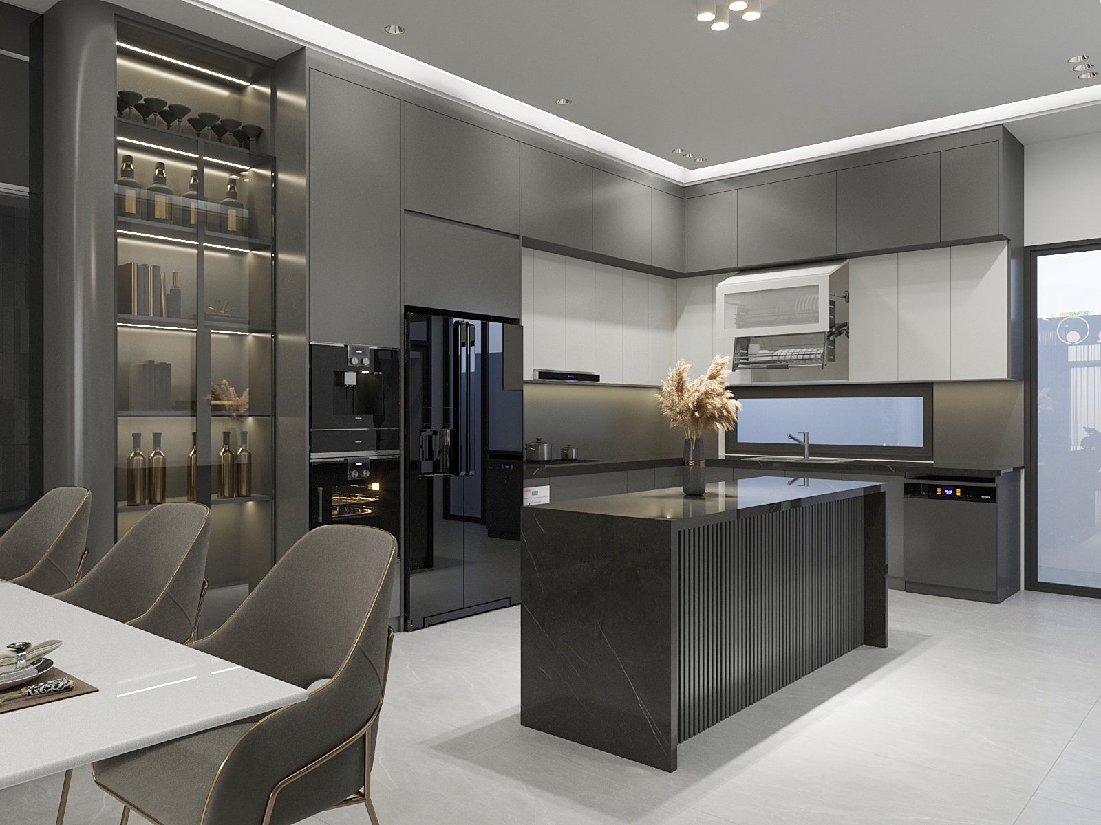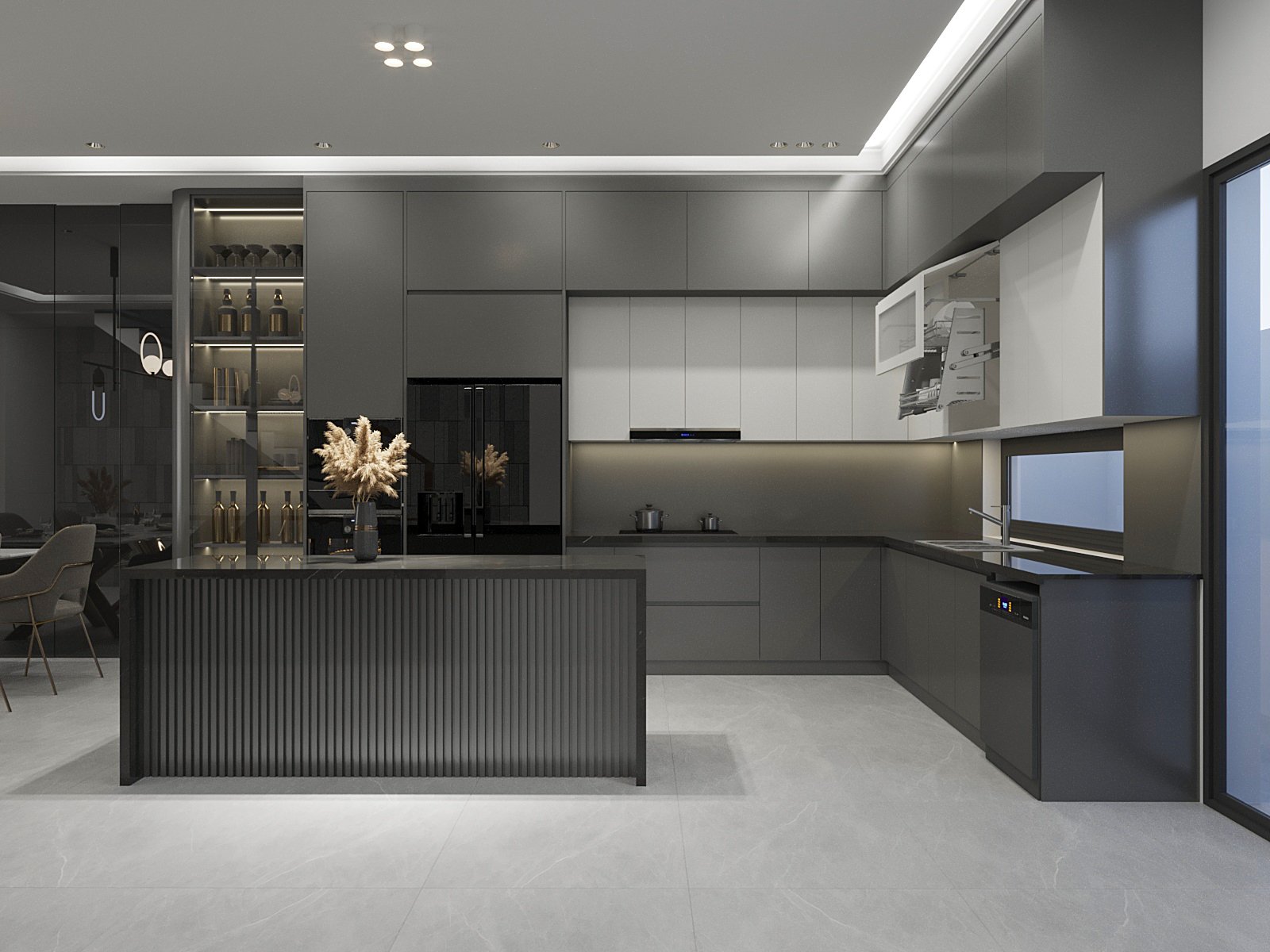 Tủ bếp được thiết kế theo tông màu xám ghi và trắng hiện đại. Kết hợp bàn đảo kiêm quầy bar tiện lợi. Phòng bếp tràn ngập ánh sáng từ cửa sổ và hệ đèn sang trọng. Tạo nên một không gian bếp đẹp mắt và tiện nghi.
