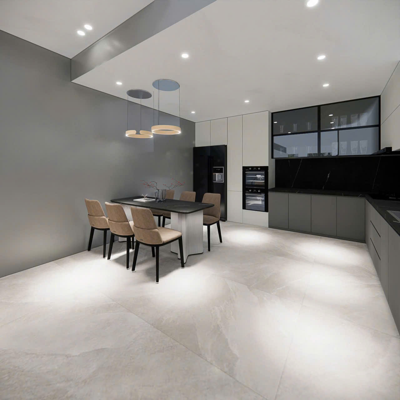 - Gạch Lát Sàn Khổ Lớn: Gạch màu trắng/ghi sáng, khổ lớn giúp giảm thiểu đường ron. Tạo cảm giác sàn nhà rộng hơn và tăng tính liên tục giữa phòng khách và phòng bếp.