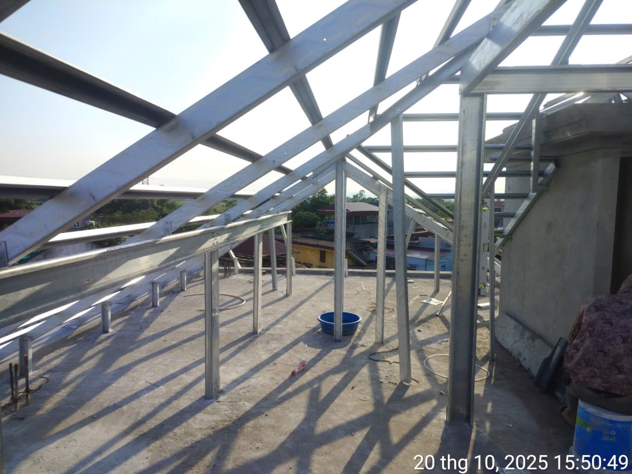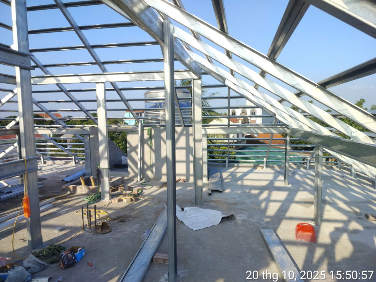 Sau khi hoàn tất xây thô tầng 2, DGROUP tiến hành đổ bê tông sàn mái. Đây là lớp sàn chịu lực và chống thấm chính cho ngôi nhà. Khi bê tông đạt cường độ, chúng tôi bắt đầu triển khai hệ khung kèo mái Nhật. Khác với mái Thái có độ dốc cao, mái Nhật đòi hỏi sự tính toán chính xác về độ dốc thoải (khoảng 25-30 độ) và sự cân đối giữa các mặt mái. Hệ vì kèo thép mạ kẽm được liên kết vững chắc, sẵn sàng cho công tác lợp ngói.