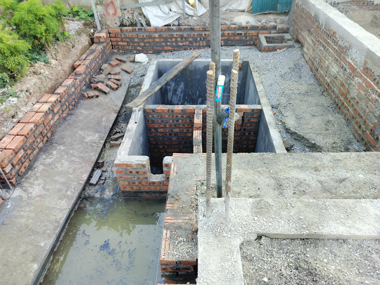 Trước khi đổ bê tông nền, hệ thống bể phốt được xây dựng kiên cố bằng gạch đặc và trát chống thấm 2 mặt kỹ lưỡng. Đồng thời, mạng lưới đường ống cấp thoát nước được lắp đặt âm nền. Công đoạn này đòi hỏi sự chính xác tuyệt đối về vị trí các đầu chờ và độ dốc ống để tránh tắc nghẽn về sau. Tất cả đường ống đều được nghiệm thu áp suất trước khi tiến hành bước tiếp theo.