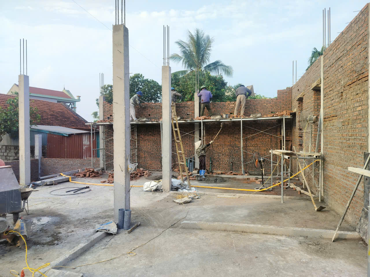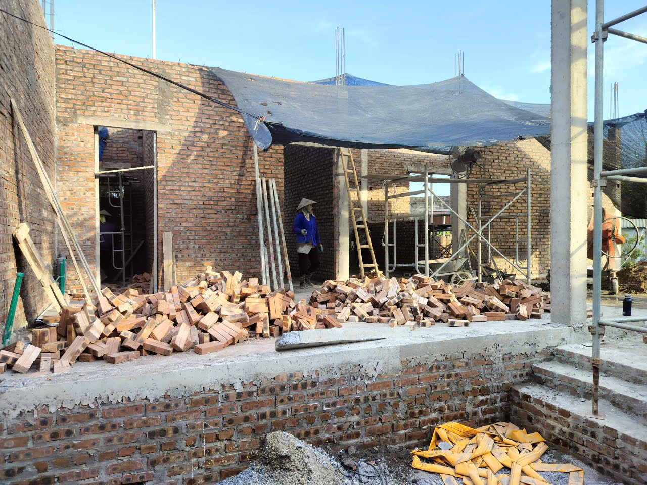 Sau khi hoàn thiện hạ tầng ngầm, lớp bê tông nền tầng 1 được đổ để tạo mặt sàn cứng cáp, ngăn hơi ẩm. Tiếp đó, đội ngũ thợ triển khai xây tường tầng 1. Với diện tích sàn lớn, công tác xây dựng được kiểm soát bằng dây dọi và thước tầm để đảm bảo tường luôn thẳng đứng, mạch vữa đều và không bị “trùng mạch”. Các vị trí lanh tô cửa cũng được đúc sẵn và lắp đặt đúng cao độ thiết kế.