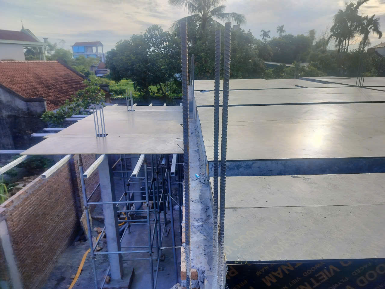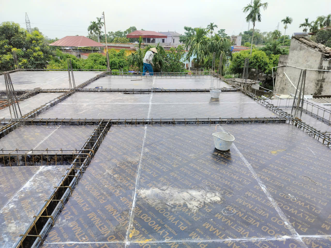 Phía trên hệ giáo, các tấm cốp pha phủ phim cao cấp được rải đều. Loại cốp pha này giúp bề mặt bê tông sau khi dỡ khuôn có độ phẳng mịn cao, giảm thiểu công tác trát trần. Hệ thống xà gồ thép bên dưới được gia cố dày đặc để chịu tải trọng của bê tông tươi và người thao tác. Mọi khe hở giữa các tấm cốp pha được xử lý bằng băng dính chuyên dụng để ngăn rò rỉ nước xi măng trong quá trình đổ bê tông.