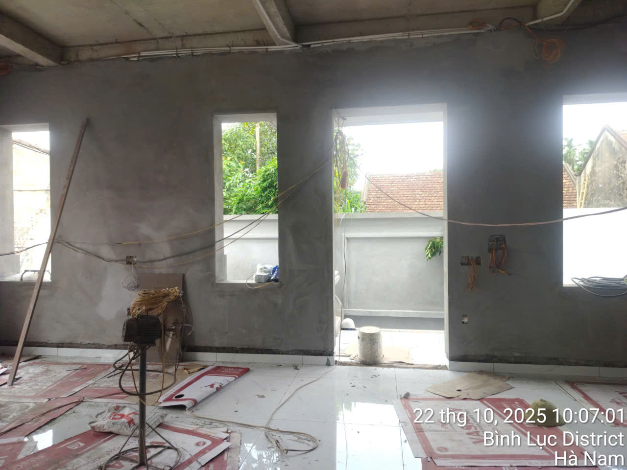 Song song với phần mái, công tác trát hoàn thiện được đẩy mạnh. DGROUP áp dụng quy trình trát 2 lớp, sử dụng lưới chống nứt tại các vị trí tiếp giáp giữa tường và dầm cột. Thợ lành nghề tiến hành “đắp mốc” chuẩn xác trước khi trát để đảm bảo tường phẳng tuyệt đối. Lớp vữa được trộn đúng tỉ lệ, cán phẳng bằng thước tầm và đánh bóng bề mặt kỹ lưỡng. Tạo tiền đề tốt nhất cho công tác sơn bả về sau.